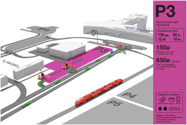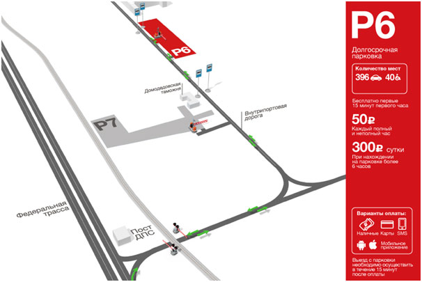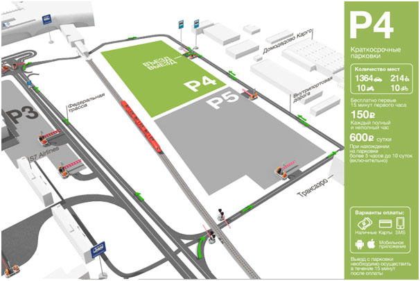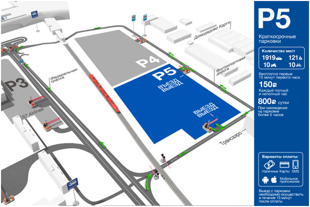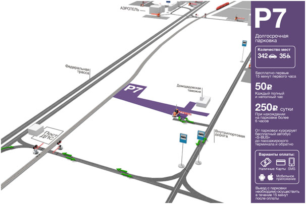 2. На электропоезде следующим по маршруту «Москва-Павелецкая» – «Аэропорт Домодедово» и «Аэропорт Домодедово» – «Москва-Павелецкая» со всеми остановками. Отправляется электропоезд с железнодорожного терминала, который расположен с правой стороны от аэровокзала Домодедово. Примерное время в пути: 1 час 10 минут. 3. Автобусами -экспресс Примерное время в пути: 30-35 мин Так же по маршруту: №308 А/п Домодедово – м. Домодедовская курсируют социальные автобусы. Они выполняют регулярные перевозки по общегородским тарифам с предоставлением льгот отдельным категориям населения Стоимость проезда на социальном автобусе: 4. Маршрутным такси по автобусному маршруту : №308 м. Домодедовская- А/п Домодедово. 5. Трансфер из аэропорта Домодедово Парковки в аэропорту ДомодедовоМосковский аэропорт Домодедово для своих гостей и пассажиров предоставляет парковочные лошадки общей вместительностью более 5000 парковочных мест. каж-дая из парковок имеет сою ценовую категорию в зависимости от удаления ее от пассажирского терминала аэропорта. Информацию о местоположении, а так же стоимости каждой из парковок можно узнать, телефон +7 495 795 38 66. Все парковки аэропорта Домодедово оборудованы специальными местами для машин людей с ограниченными физическими возможностями , а так же парковками для мото-транспорта. При длительной стоянке Вашего автомобиля , в случае разрядки аккумуля-тора , есть бесплатный сервис «запуска автомашины», телефон +7 916 509 52 93 План парковочных мест аэропорта ДомодедовоВнимание! на парковках Р1 и Р4 предусмотрена система абонементов.